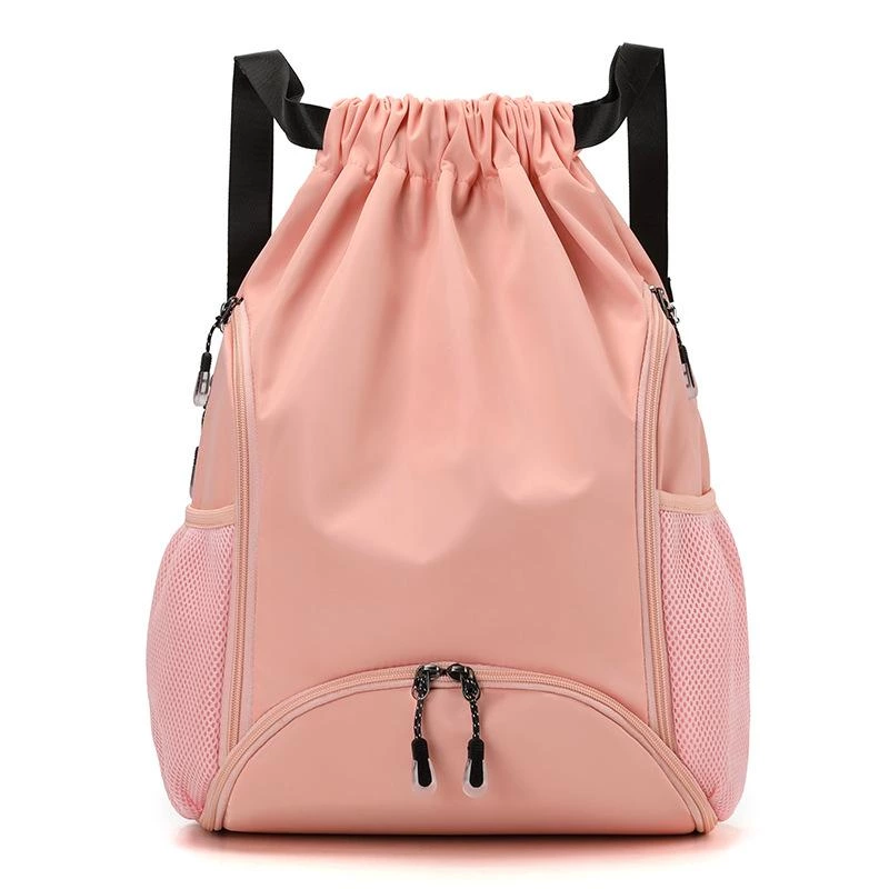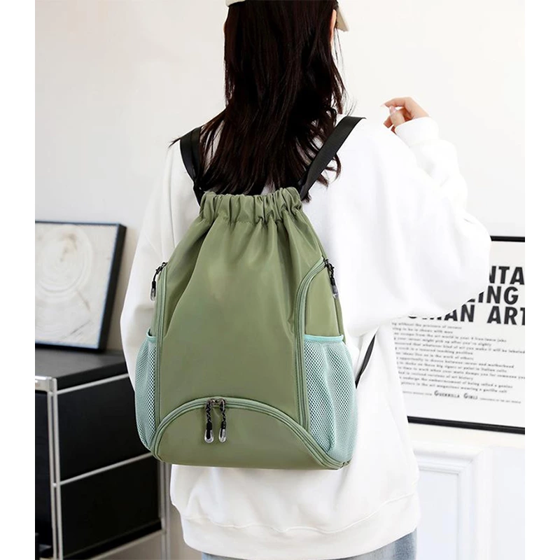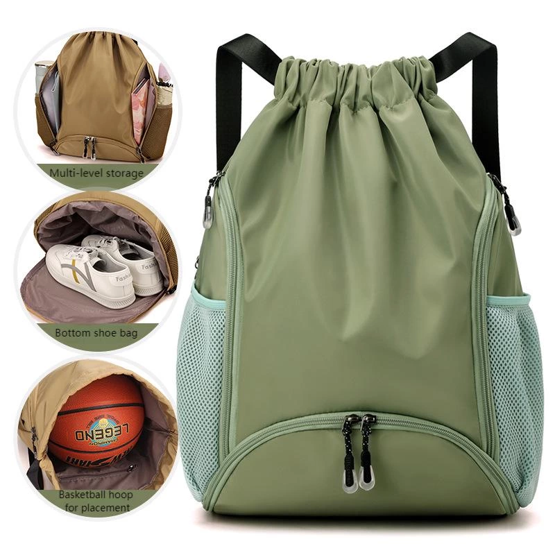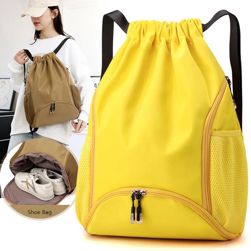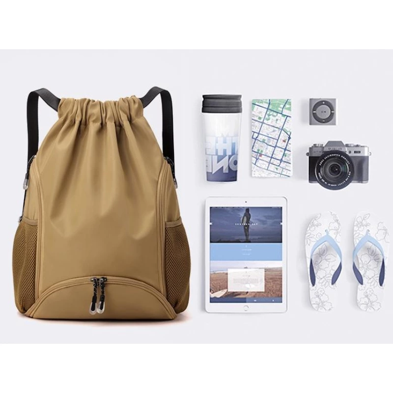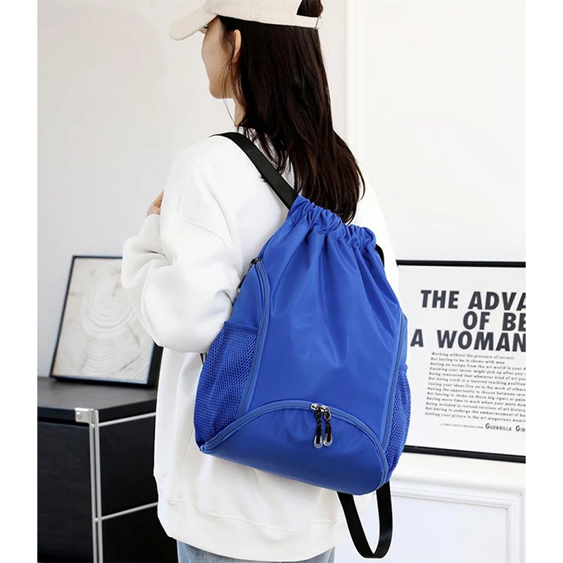 A spacious drawstring gym bag large enough for a basketball, featuring a convenient cinch-top closure and a separate bottom shoe compartment. With side pockets and a waterproof Oxford build, it’s perfect for sports, workouts, and versatile on-the-go storage.