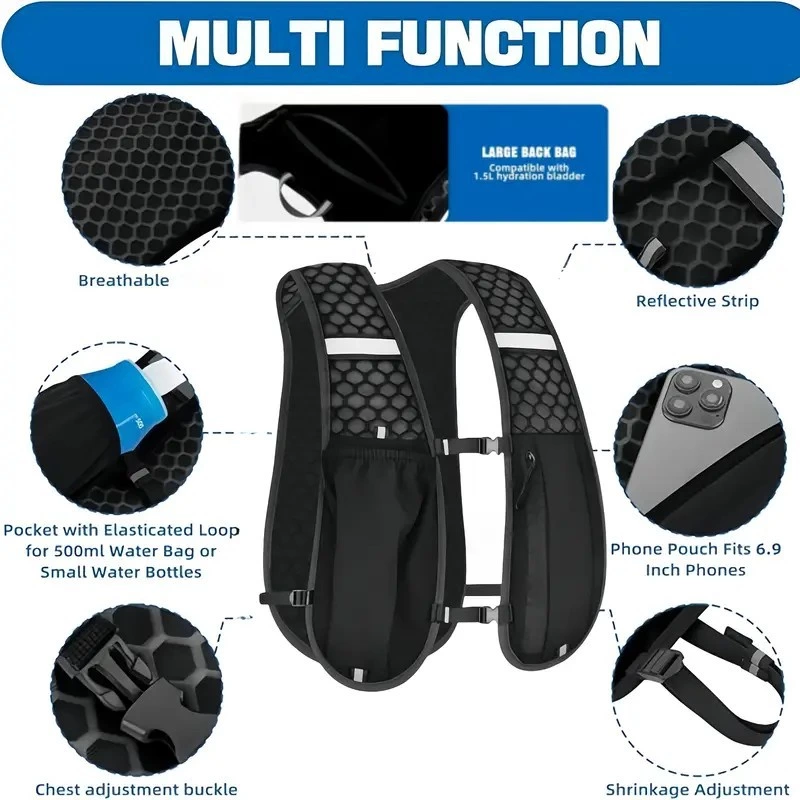 Designed for safety and hydration on the move, this reflective waist belt securely holds water bottles and large phones while keeping you visible at night. Featuring a breathable honeycomb back pad and side storage pockets, it offers lightweight, practical convenience for runs, hikes, and active commutes.