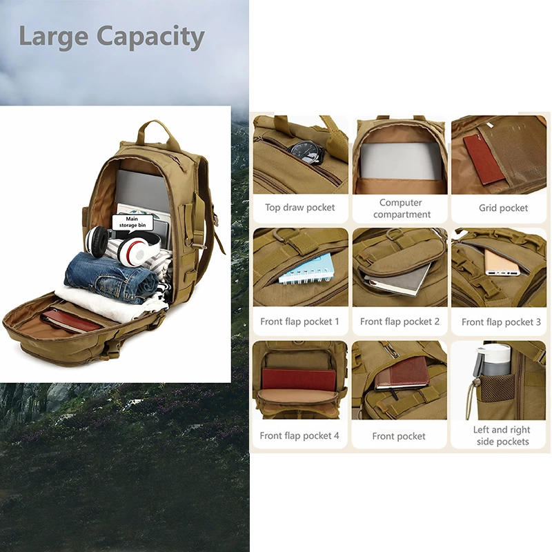 Designed for extended journeys, this stylish outdoor backpack combines a lightweight, water-resistant build with abundant, versatile storage. Featuring dedicated holders for gear like cups and trekking poles alongside multiple accessible pockets, it ensures organized, effortless carrying for long-duration travel and daily use.