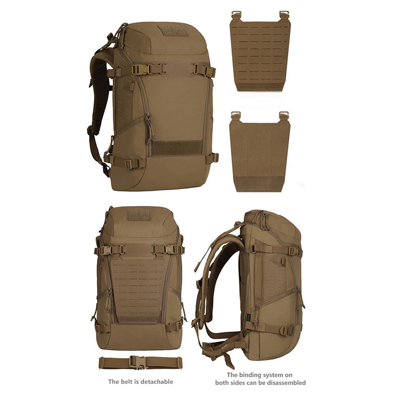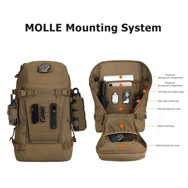 Engineered for modularity and secure transport, this backpack features a removable MOLLE expansion panel and a padded compartment for up to a 17-inch laptop. With multiple classified pockets and a convenient back luggage strap, it offers versatile, shock-resistant organization for travel, tech, and tactical use.